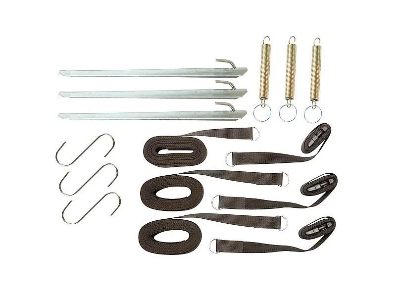 De driedelige Obelink stormlijnset is voor bevestiging op de punten van de tent en is gemakkelijk te bevestigen. Deze set zorgt ervoor dat de (voor)tent stevig op de grond blijft staan en niet door de wind kapot gaat.